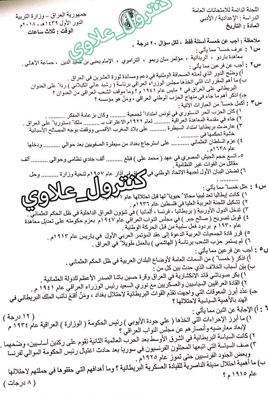 أسئلة التاريخ للصف السادس الادبي الدور الاول 2018 مع الاجوبة النموذجية
