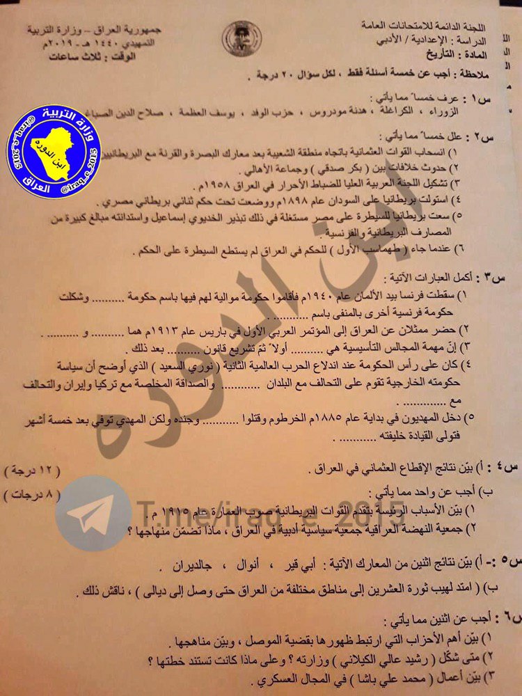 اسئلة مادة التاريخ للصف السادس الادبي مع الأجوبة امتحانات التمهيدي الخارجية 2019
