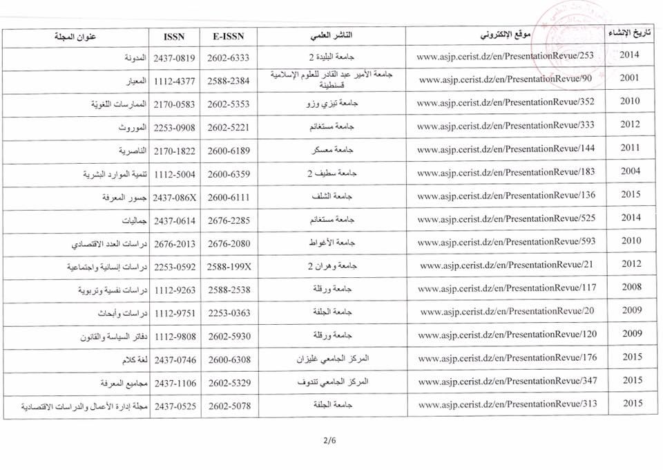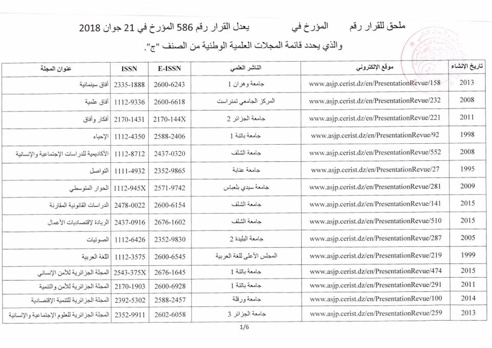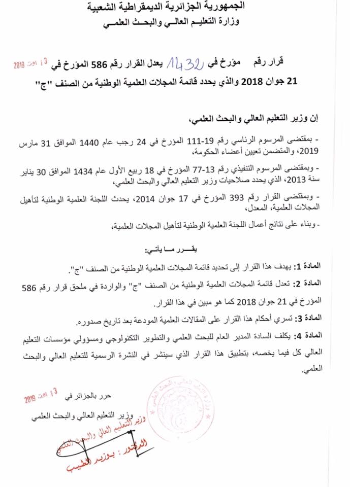 قرار رقم 1432 يعدل القرار رقم 586 المؤرخ في 13 اوت 2019 و الذي يحدد قائمة المجلات العلمية الوطنية من الصنف ج