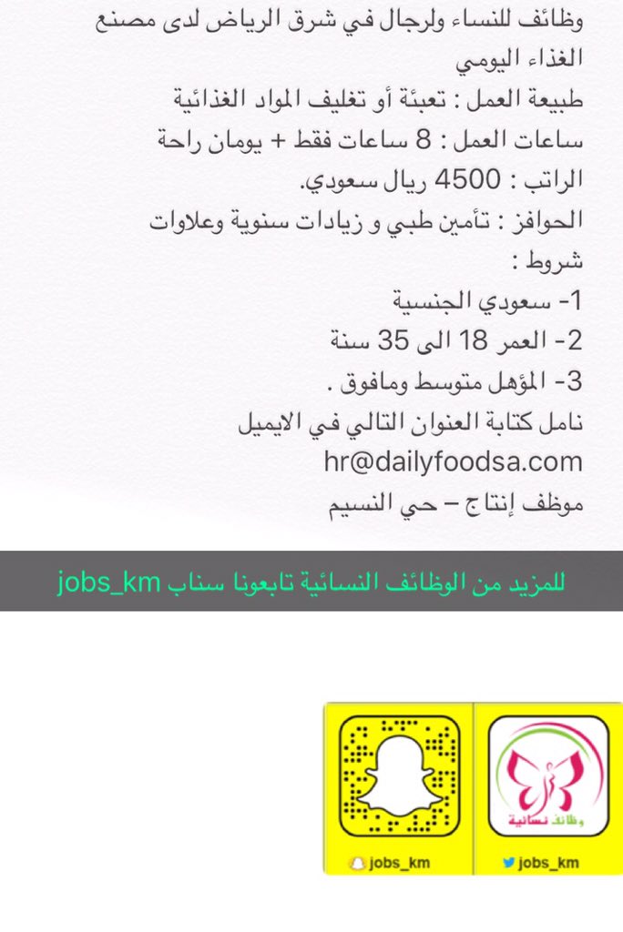 وظائف نسائية No Twitter وظائف نسائية في الرياض وظائف للنساء ولرجال في شرق الرياض لدى مصنع الغذاء اليومي طبيعة العمل تعبئة أو تغليف المواد الغذائية ساعات العمل 8 ساعات فقط يومان