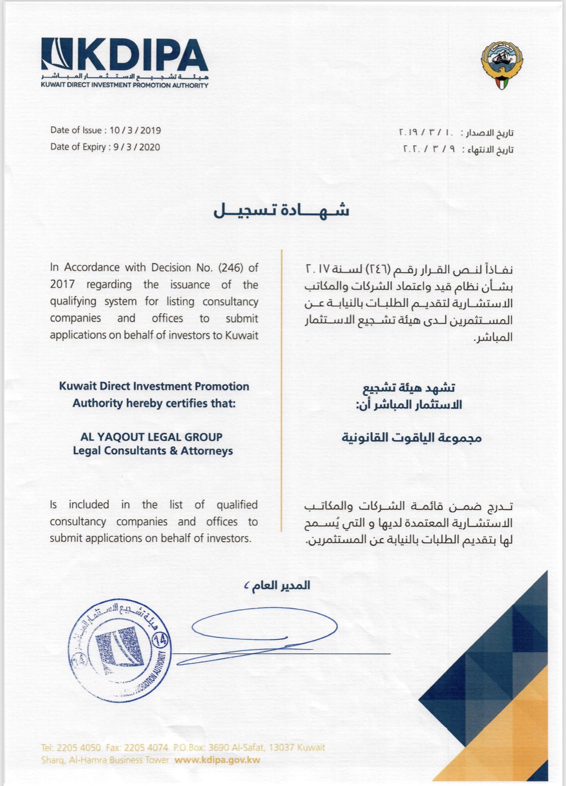 Alyaqout Alfouzan Legal Group Sur Twitter Al Yaqout Legal Group Is Proud To Officially Announce That It Has Been Certified By Kuwait Direct Investment Authority Kdipa As An