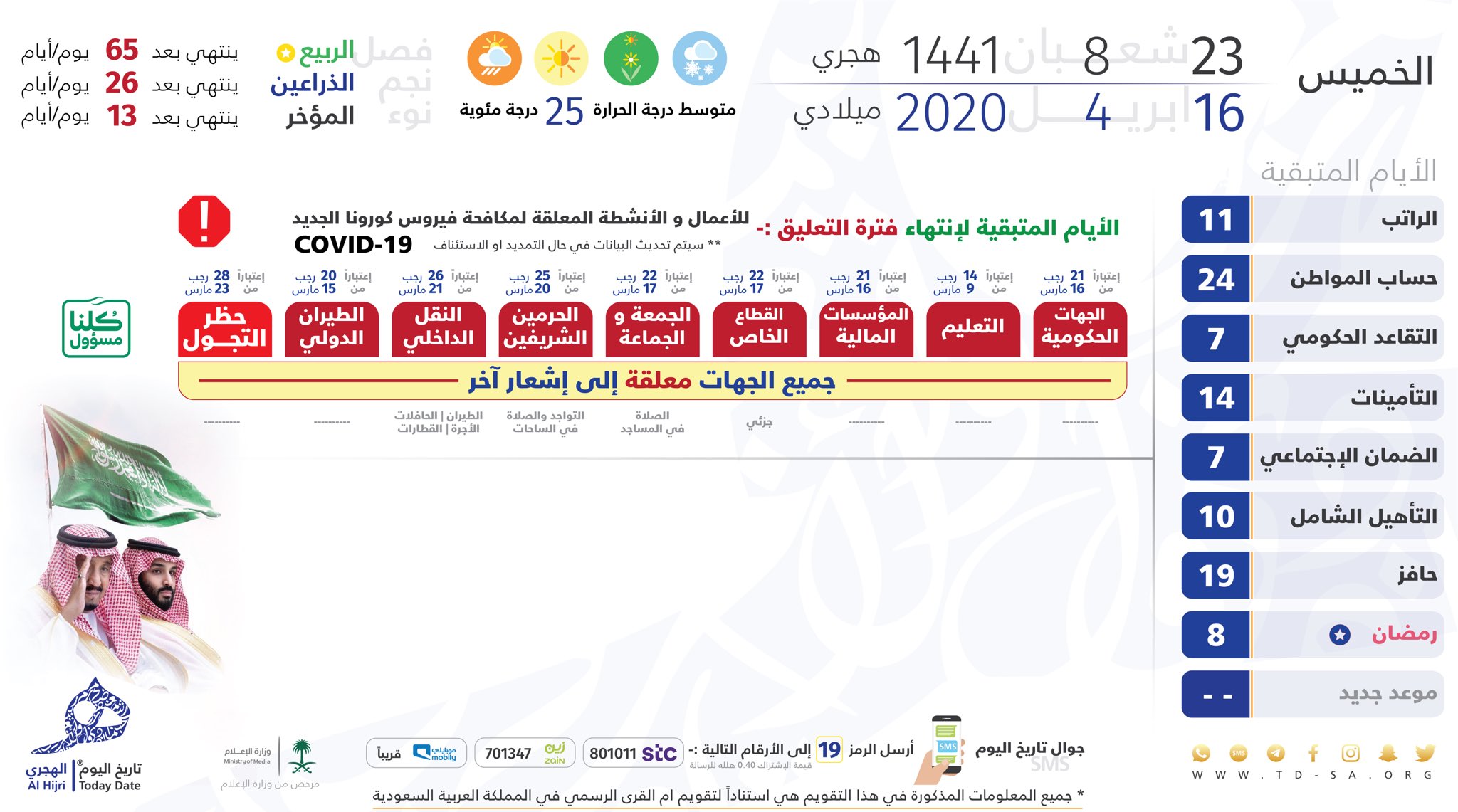تاريخ اليوم الهجري On Twitter الخميس 23 شعبان 8 1441هـ يوافق 16 أبريل 4 2020م أيام متبقية الراتب 11 ح المواطن 24 تقاعد حكومي 7 تقاعد خاص ساند 14 الضمان 7 التأهيل 10 حافز 19 رمضان 8 حظر التجول حتى إشعار آخر Https T Co Ogah7evyyd