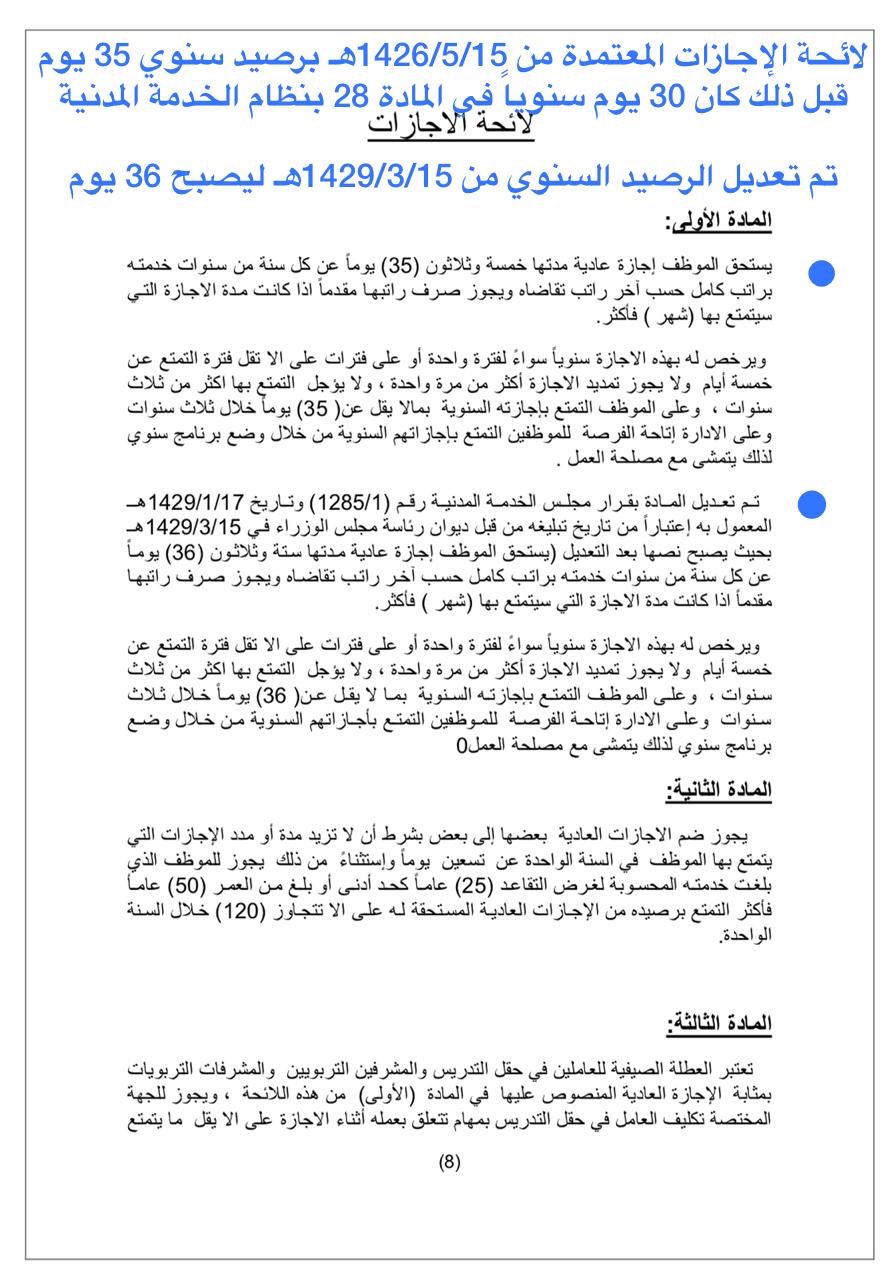 قـرار Qarar Auf Twitter عليكم السلام الرصيد السنوي للموظف من الإجازة العادية كان 30 يوما بالمادة 28 من نظام الخدمة المدنية تم تعديل الرصيد إلى 35 يوما عند اعتماد لائحة الإجازات من 1426 5 15هـ