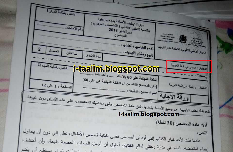 مباراة التعاقد يناير 2018 اختبار مادة اللغة العربية لسلك التعليم الابتدائي عناصر الاجابة