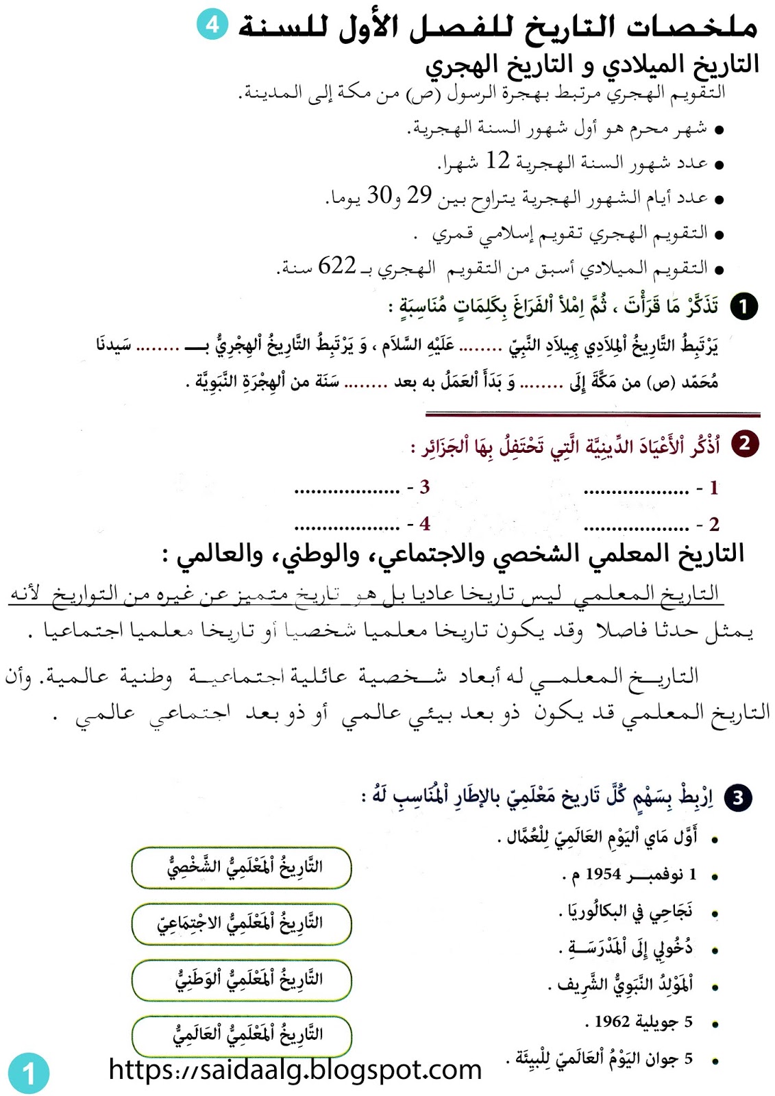 ملخصات دروس التاريخ نماذج اختبارات الفصل الأول للسنة الرابعة ابتدائي